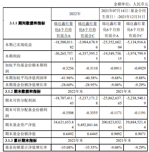 瑞达鑫红量化2022年的年报显示,该产品近一年A份额净值增长为-28.6%,C份额净值增长为-28.95%,近一年合计亏损3662万元。而2021年7月基金成立至2021年末的亏损为2352万元。然而,该基金成立时募集资金为2.44亿元,至今年二季度,已经仅剩0.39亿元。