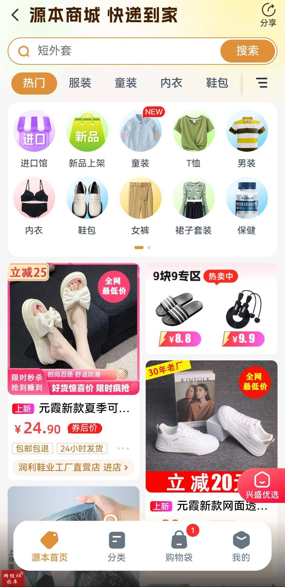 8月10日消息,兴盛优选近期新增了“源本商城”业务,页面布局类似于于淘宝、京东等传统电商平台。产品分类包括服装、鞋包、百货、食品、个护、运动、电器、首饰、书籍、医药等多个品类,以低价商品为主。
