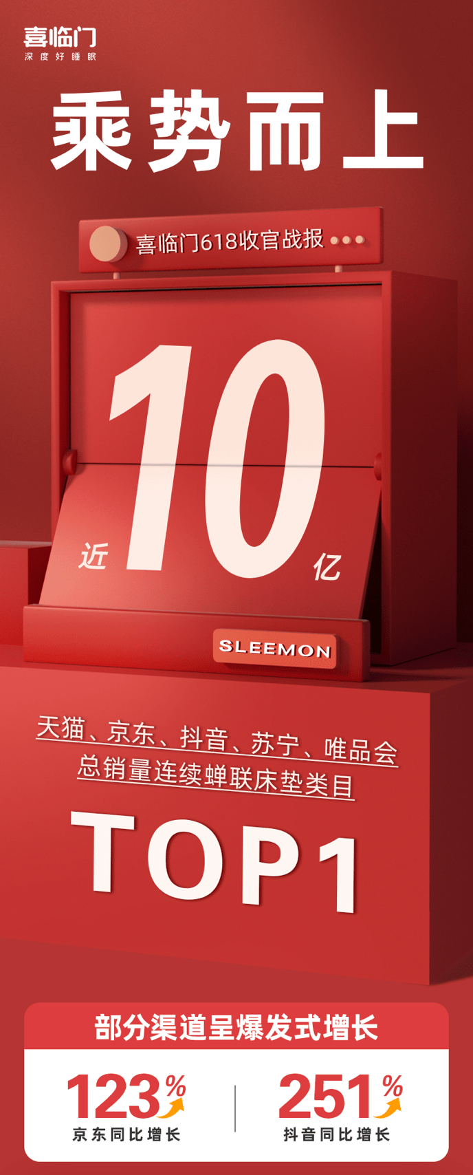 受益于全渠道+多平台+多矩阵直播实现破壁传播,喜临门在今年618活动中表现亮眼。数据显示,今年618活动(5月23日-6月20日)期间,喜临门全网销售额近10亿元,蝉联天猫、京东、抖音、苏宁、唯品会等多平台床垫类目总销量TOP 1。其中,喜临门在京东平台销售同比增长123%、抖音渠道销售同比增长251%,均呈爆发式增长。