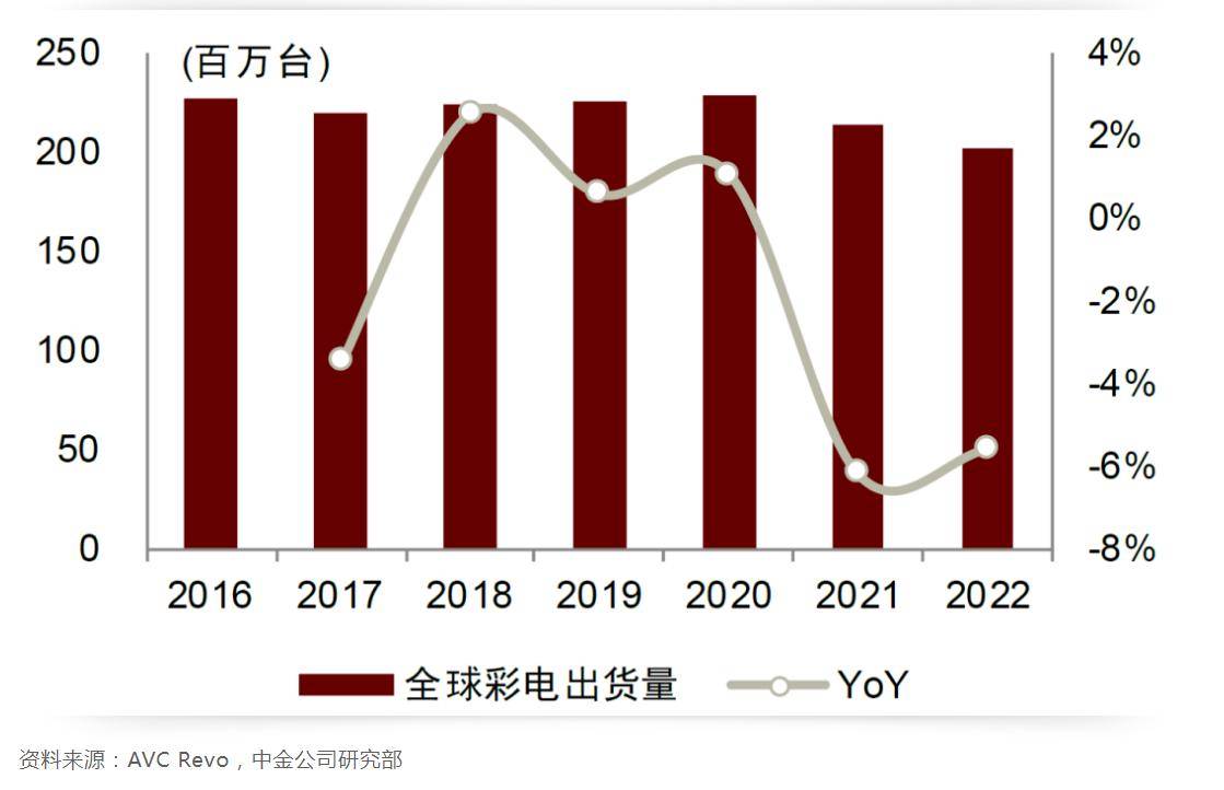 2020年疫情导致欧美居家类需求快速增长,在政策补贴刺激下,2020年第三季度全球彩电出货量开始呈增长趋势,2020年全球彩电出货量同比增长1%;2021年美国个人消费补贴更多转向制造业和基建,叠加2020年欧美需求透支、2021年海运费上涨、彩电整机成本上涨等因素,欧洲及美国市场需求明显转弱,带动2021年下半年全球彩电出货量同比增速开始回落,2021、2022年全球彩电需求进一步收缩。