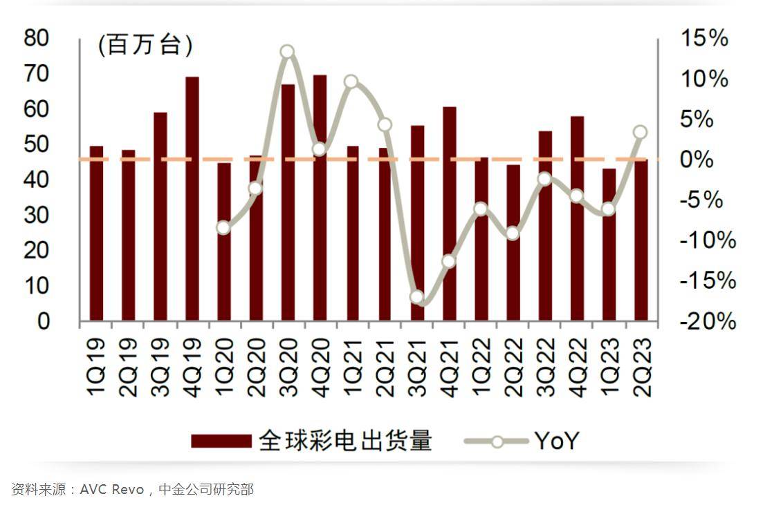 2023年以来全球彩电需求仍较弱,新兴市场表现较好。根据AVC Revo数据,2023年一季度和二季度全球彩电出货量分别同比下降6.3%和增长3%,全球彩电整体需求仍较为疲软。
