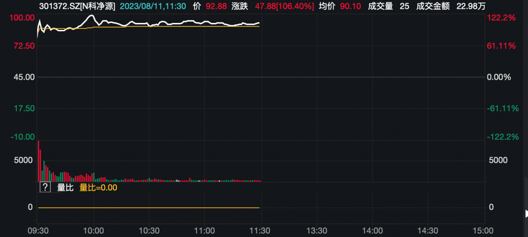 此外,新股成为上午市场亮点之一,今天上市的新股科净源上午盘中涨幅一度达122.2%。