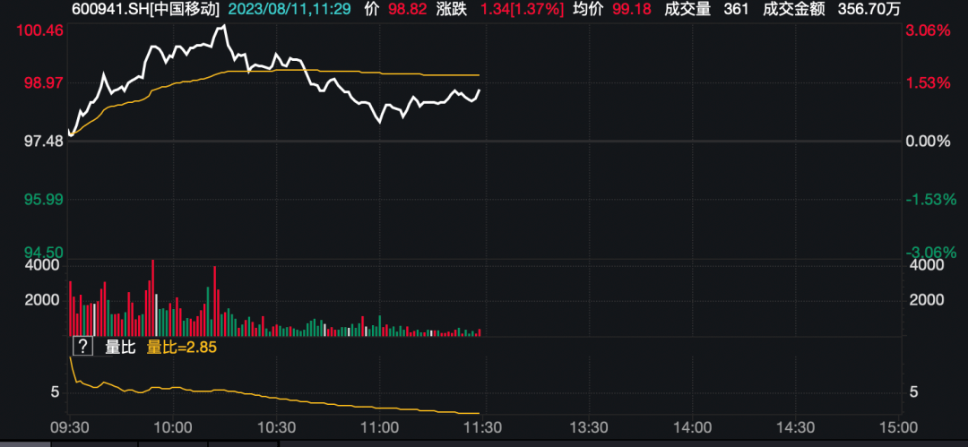 中国移动A股今天上午上涨1.37%。