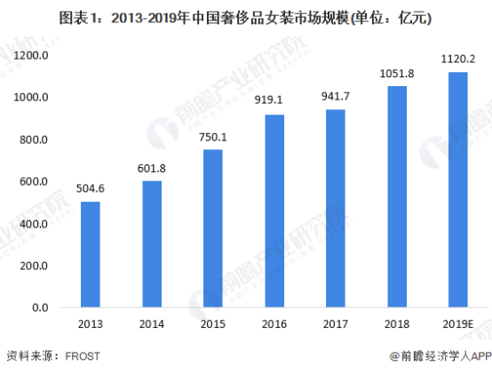 我国正在取代传统欧美国家成为奢侈品消费的主力军,国际各大奢侈品牌也越来越重视中国市场的地位。根据FROST&SULLIVAN发布的数据,奢侈品女装2013-2018年市场规模由504.6亿元增长为1051.8亿元,年均复合增长率达15.8%,2019年我国奢侈品女装市场规模有望达到1120.2亿元,同比增长6.5%。