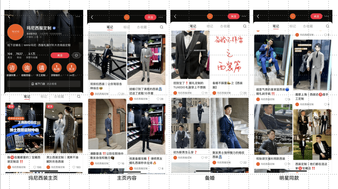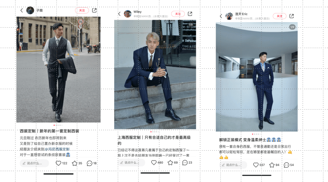 西装定制行业核心是引流到店,笔记围绕用户痛点,激发用户感兴趣来店,然后沉淀到私域来进行运营。