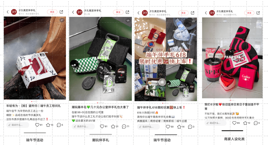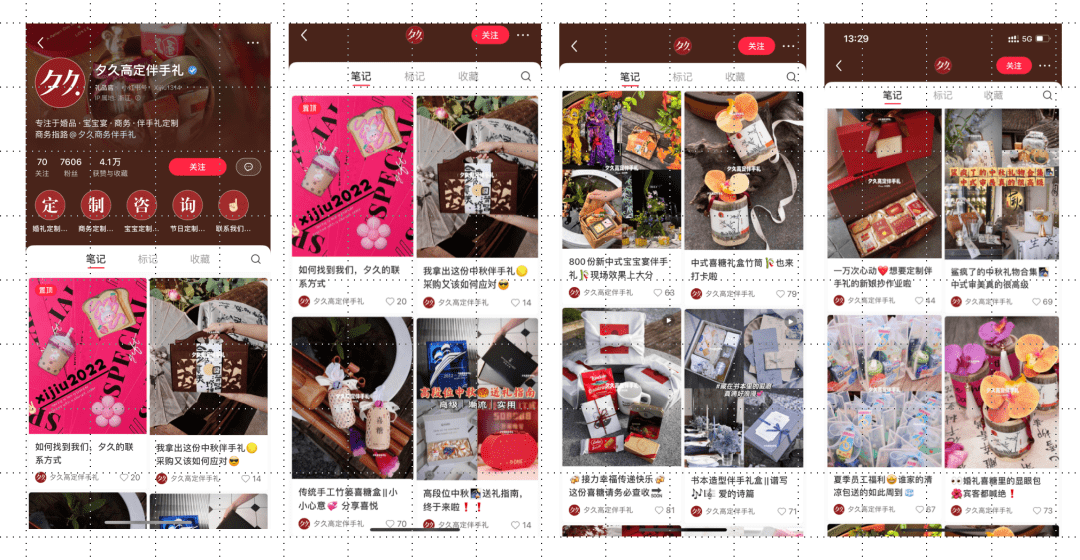 专注婚品、宝宝宴、商务、伴手礼等领域,在小红书有7600粉丝,内容聚焦中秋、员工夏日福利、书本造型等内容,产品也是实拍进行拍摄,大号发布,小红书主页引流。