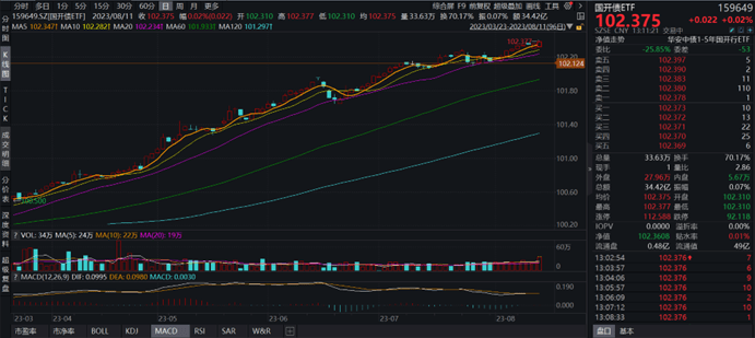 截至13:11,国开债ETF(159649)窄幅震荡飘红,现涨0.02%,成交额持续扩大,市场交投活跃。数据显示,该基金盘中成交价一度到达102.377元,为历史最高价。