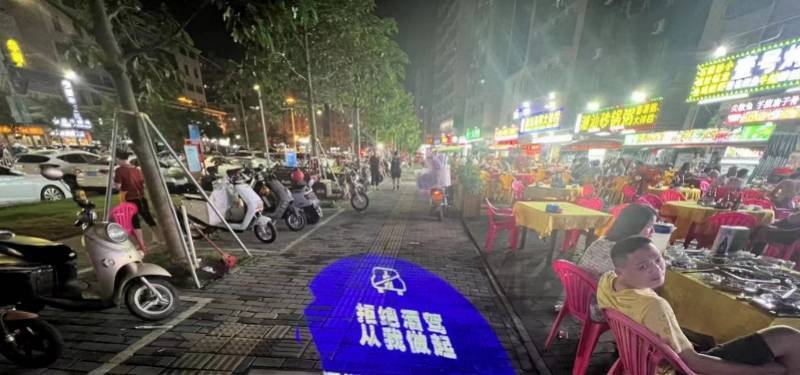 据悉,为预防和减少涉酒驾行为,公明街道联合市交警部门指导辖区5家餐饮、娱乐场所及6个城中村、小区安装了11处射灯,利用射灯将“拒绝酒驾,从我做起”的宣传语投射到门前、出入口或墙面等显眼位置,引导司机切实做到“开车不喝酒,喝酒不开车”。