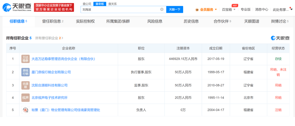 DoNews:盘点万达刘海波商业版图 万达刘海波名下多家企业曾被吊销 万达高级副总裁刘海波被公安带走