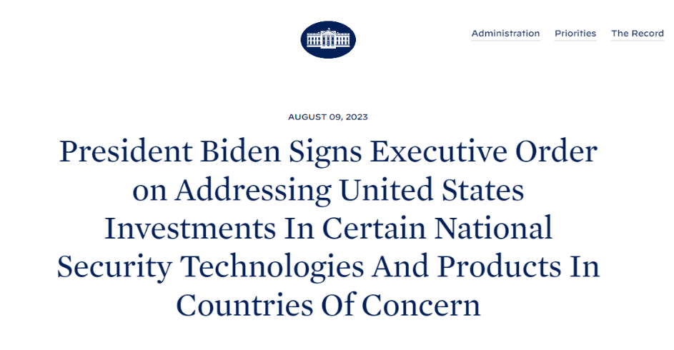 回顾:本周三美国总统拜登签署了关于“对华投资限制”的行政命令,该命令将严格限制美国对中国敏感技术领域的投资,并要求美企就其他科技领域的在华投资情况向美政府进行通报。包括半导体、AI、量子信息领域,中国驻美国使馆发言人刘鹏宇同日晚些时候作出回应,对于拜登9日签署上述行政令表示非常遗憾。