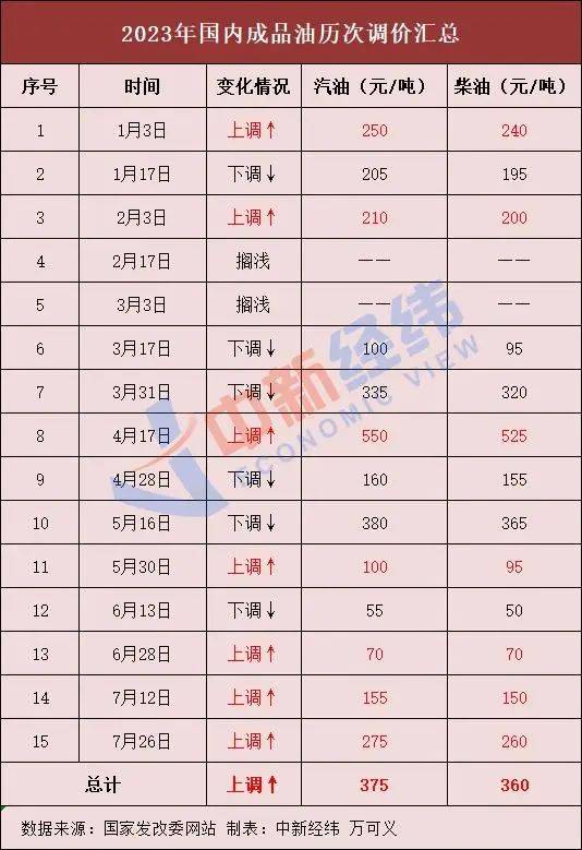 记者梳理发现,国内成品油在今年已历经十五轮调整,汽油价格累计上涨375元/吨,柴油价格累计上涨360元/吨。此次价格上调如落实,将是年内首次四连涨,2023年成品油调价将呈现“八涨六跌两搁浅”的格局。
