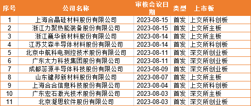 沪深交易所方面,东方财富显示,2023年8月前半段共有11家IPO上会企业,其中科创板3家、创业板4家、主板4家。