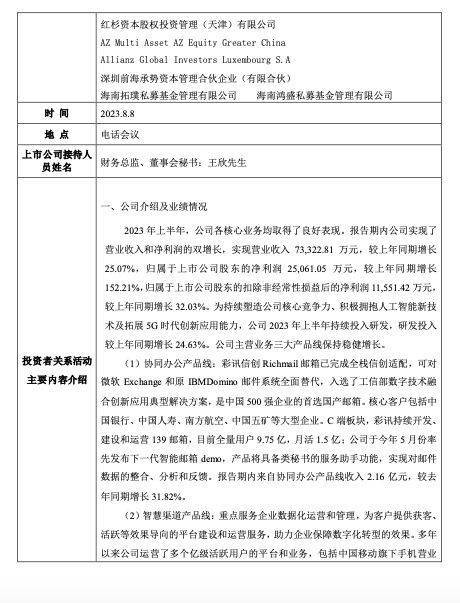 彩讯科技股份有限公司(以下简称“彩讯股份”或“公司”)8月10日晚间发布公告称,公司于8月8日与多家机构投资者进行了电话会议。在会议上,彩讯股份透露,2023年上半年,公司各核心业务均取得了良好表现。报告期内公司实现了营业收入和净利润的双增长,实现营业收入73,322.81万元,较上年同期增长25.07%,归属于上市公司股东的净利润25,061.05万元,较上年同期增长152.21%,归属于上市公司股东的扣除非经常性损益后的净利润11,551.42万元,较上年同期增长32.03%。