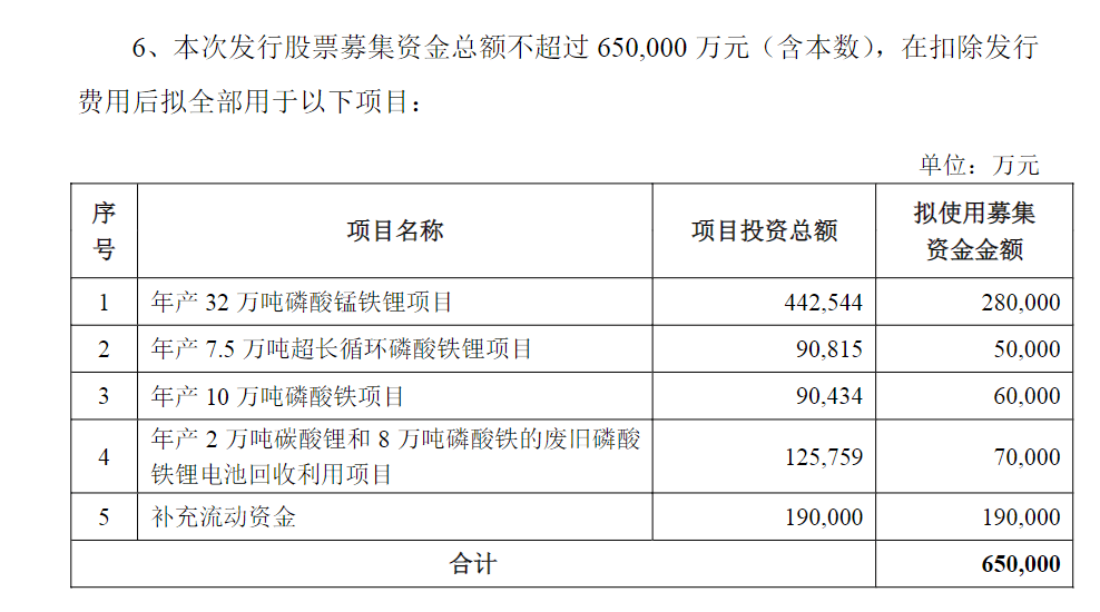 预案显示,公司本次定增募集资金将主要用于扩产磷酸锰铁锂等锂电池正极材料及补充流动资金,其中19亿元用于补流,