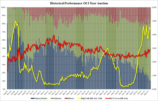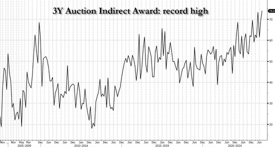但是,此前美国国债拍卖的认购倍数主要是受到其国内(即直接买家)井喷式需求的推动,相比之下,这一次外国买家(即间接买家)似乎没有受到阿克曼最新警告的影响——此次拍卖中外国买家的比例从69.4%飙升到74.0%,这是有史以来的最高纪录。