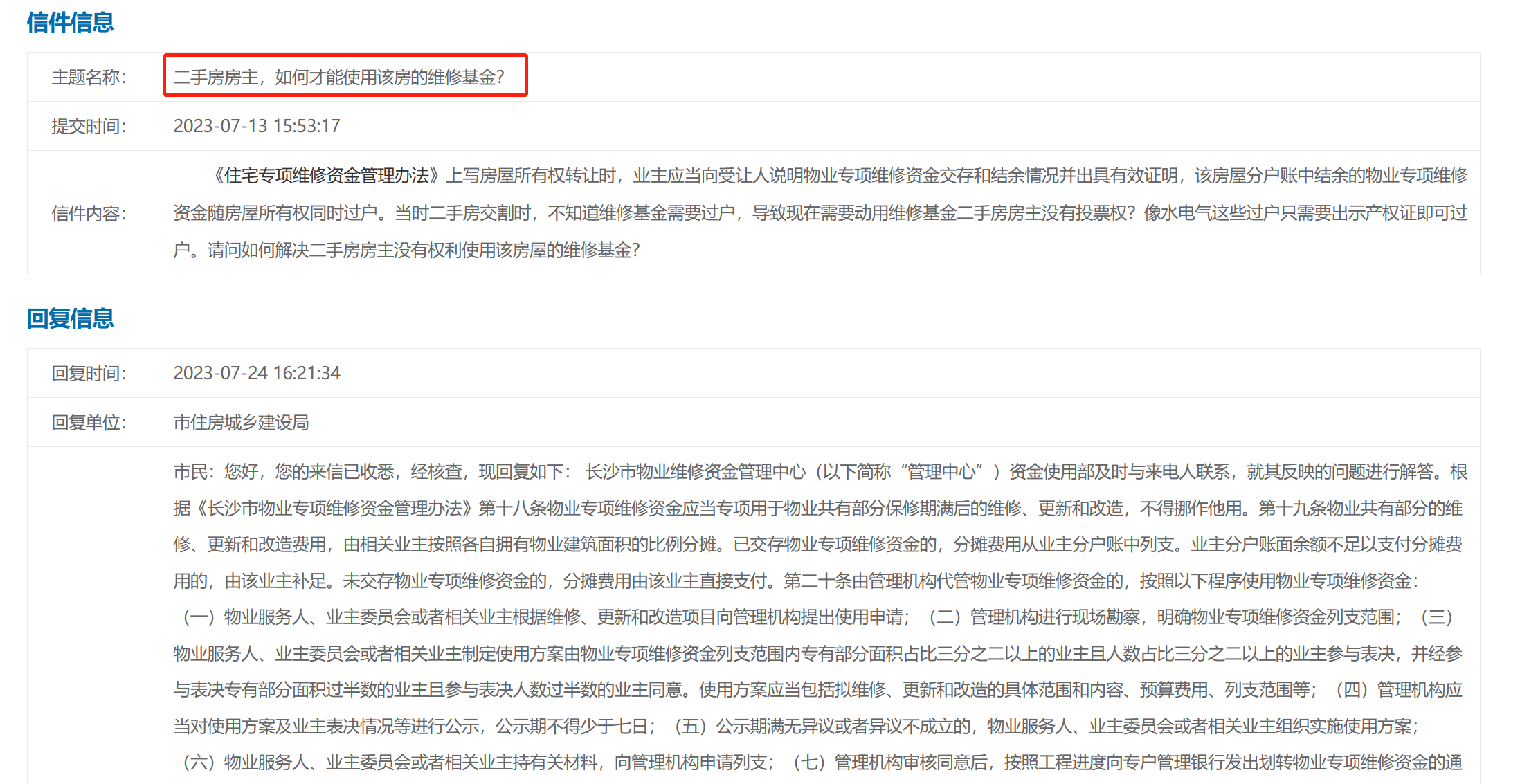 近日,有长沙市民在市长信箱留言表示,“当时二手房交割时,不知道维修基金需要过户,导致现在需要动用维修基金二手房业主没有投票权,二手房业主如何使用维修基金?”