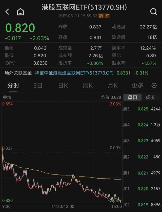 场内热门ETF方面,重手聚焦港股互联网龙头股的港股互联网ETF(513770)高开低走,全天呈单边下挫态势,尾盘场内价格收跌2.03%,成交额2.26亿元。