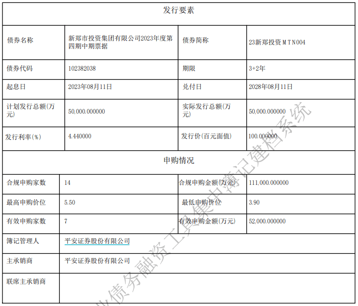 据悉,本期债券简称23新郑投资MTN004,发行金额5亿元,利率4.44%,期限3+2年,起息日为2023年8月11日,兑付日为2028年8月11日,薄记管理人及主承销商为平安证券。募集资金拟全部用于偿还有息负债。