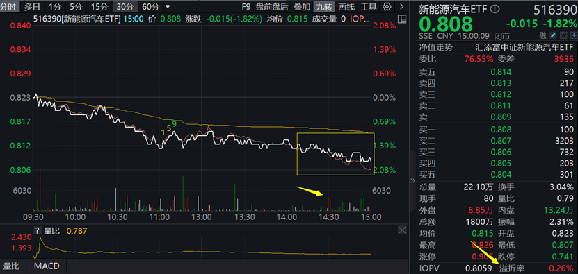 主流ETF方面,新能源汽车ETF(516390)收跌1.82%,成交额达1800万元,尾盘溢价走阔,收盘溢价率达0.26%,或有资金尾盘入场。