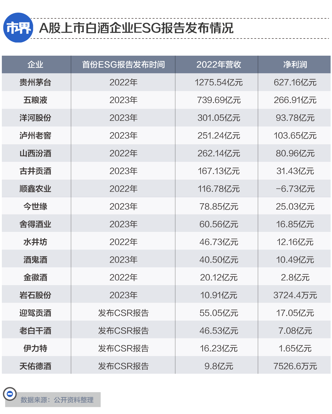 如果说2022年是国内白酒行业ESG起步的“元年”,那么,2023年这个行业已正式迈入了ESG时代。目前,港交所要求港股上市企业必须披露ESG信息;但在A股,并不是所有上市公司都被要求必须进行披露。但A股进行披露的白酒企业,仍从去年“凤毛麟角”的5家增长到今年的13家,上市酒企们对ESG的重视程度可见一斑。在A股市场上,贵州茅台的市值一路遥遥领先,并跻身全球前20大市值公司行列。但在2021年7月,全球大型指数公司MSCI(明晟)将贵州茅台的ESG评级,从B级下调到了最低一档——CCC级。当时海外基金大量减持贵州茅台股票,部分投资者在谈起此事时,也归因于贵州茅台在ESG披露方面的缺失。ESG信息披露,在资本市场衡量酒企的长期价值时,分量越来越重了。在这样的市场情况下,2022年有5家A股上市酒企先后发布了ESG报告,分别是金徽酒、贵州茅台、水井坊、顺鑫农业和山西汾酒。此外,这一年还有9家A股上市酒企披露了独立的CSR报告。但当时,A股酒企们无论是从ESG信息披露的数量,还是内容上来看,都还存在着很多不足。很多企业的ESG报告内容和自己的年报相比,并没有实质性的区别。酒企是用水大户,对自然资源依赖性强,它们的粮食需求量大,废水排放量也大,能耗较大,污染负荷高;同时,众所周知,过度饮酒有损健康,而酒类产品直接对消费者销售,在这方面也受到了外界关注。因此,环保和社会责任议题,应该是酒类企业在ESG披露中较为侧重的方面。大部分酒企在其ESG报告中都设置了实质性议题,囊括了ESG指标的各个方面,但是却“雨露均沾”,对每个议题给予的篇幅都大致相当。虽然全面,但是对于重点议题,并没有给到更多的倾斜。而在能耗方面,对于耗水量等具体数据指标,不少企业也并没有具体披露。在贵州茅台的报告中,甚至部分数据,如其二氧化硫平均排放浓度,还出现了和企业年报数据不一致的情况。在2023年,这些情况都得到了改善。这首先体现在了A股披露ESG报告的白酒企业数量上,上市酒企从CSR报告向ESG报告转变已成为大趋势。此外,值得一提的是,ESG披露和企业的业绩表现之间,也呈现出关联。在经济复苏的大背景下,财务数据表现良好的企业,也更加重视公司治理、质量管理等,并积极承担社会责任、关注环境生态。在今年首次披露ESG报告的上市白酒企业中,只有生产上海贵酒的岩石股份,在2022年出现了“增收不增利”的情况。同时,酒企们也开始更加重视如何进行自己的ESG叙事了——和公司的战略结合更紧密。