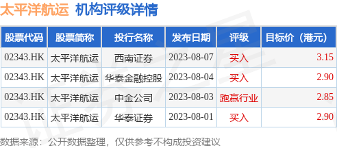 截至2023年8月11日收盘,太平洋航运(02343.HK)报收于2.07港元,下跌1.66%,换手率0.39%,成交量2047.8万股,成交额4250.33万港元。投行对该股的评级以买入为主,近90天内共有3家投行给出买入评级,近90天的目标均价为2.95港元。西南证券最新一份研报给予太平洋航运买入评级,目标价3.15港元。