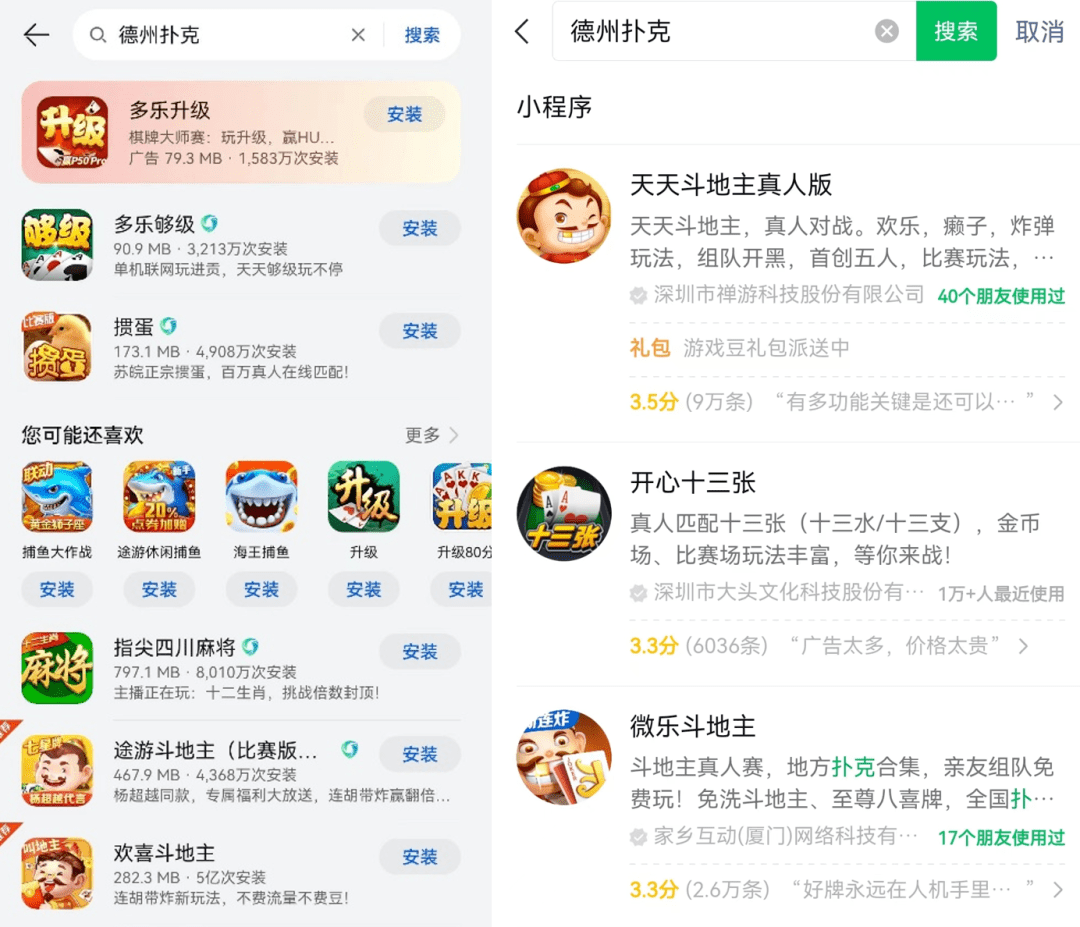 野马财经在应用商店、微信小程序搜索“德州扑克”,均没有找到相关游戏的踪影。