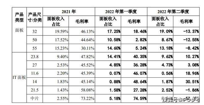 随着整个面板行业下行趋势的持续,惠科股份的盈利能力也在不断被压缩。2021年,惠科股份还可以将大部分产品的毛利率维持在45%左右,但到了2022年第一季度,个别产品的毛利率就已经下滑至个位数,第二季度,不少产品毛利率下滑至负值。