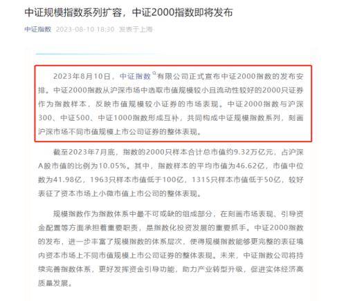此前,中证指数有限公司表示,8月11日中证2000指数正式发布。而中证2000指数是从沪深市场中选取市值规模较小且流动性较好的2000只证券作为指数样本,反映市值规模较小证券的市场表现。中证2000指数与沪深300、中证500、中证1000指数形成互补,共同构成中证规模指数系列,刻画沪深市场不同市值规模上市公司证券的整体表现。