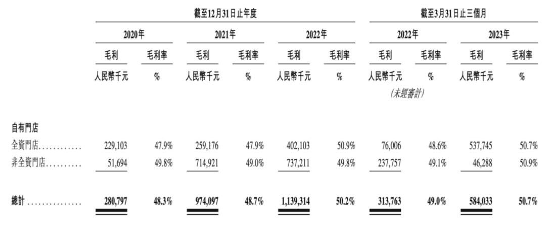 报告期内,自有门店的毛利率分别为48.3%、48.7%及50.2%。而加盟门店的毛利率为20.3%、23.4%及21.1%。