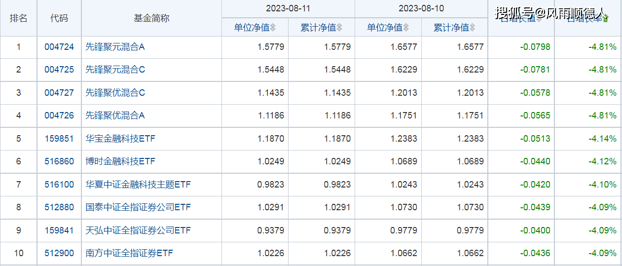 11日开放式基金净值增长排名后10的基金分别是:先锋聚元混合A、先锋聚元混合C、先锋聚优混合C、先锋聚优混合A、华宝金融科技ETF、博时金融科技ETF、华夏中证金融科技主题ETF、国泰中证全指证券公司ETF、天弘中证全指证券公司ETF、南方中证全指证券ETF。