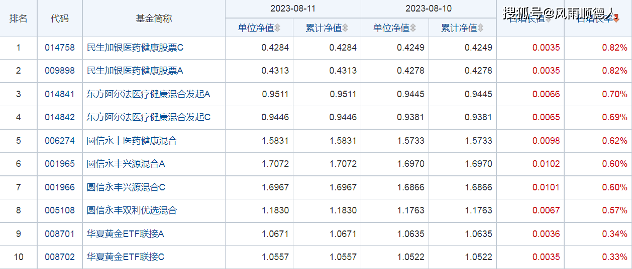 11日开放式基金净值增长排名前10的基金分别是:民生加银医药健康股票C、民生加银医药健康股票A、东方阿尔法医疗健康混合发起A、东方阿尔法医疗健康混合发起C、圆信永丰医药健康混合、圆信永丰兴源混合A、圆信永丰兴源混合C、圆信永丰双利优选混合、华夏黄金ETF联接A、华夏黄金ETF联接C。
