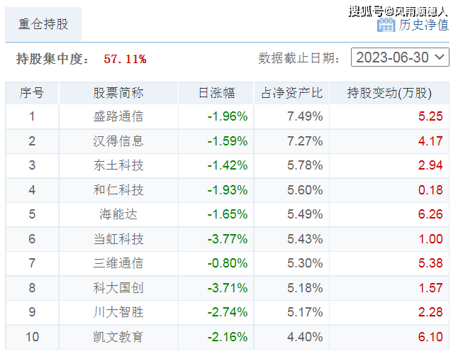 该基金的十大持仓中当虹科技、科大国创、川大智胜、凯文教育跌幅较大,其余持仓今天都有一定的跌幅,前十大持仓占总持仓57.11%,持股集中度:57.11%,持股集中度较散,基金净值相对跑输市场(属于一般的主动型混合基金)【基金规模0.03亿元】。