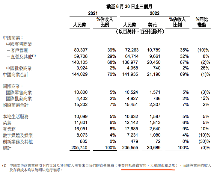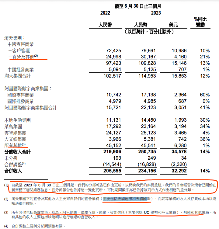 再看直营业务,今年的二季度财报,阿里是按照架构调整之后的框架公布数据:“自截至 2023 年 6 月 30 日止三个月起,我们的分部报告已作出更新,以反映我们的架构重组。我们的首席经营决策者已开始在新架构下审阅业务信息,且分部报告也依据这一变化更新。可比期间数字亦已依据该列示方式作出相应的重分类。”