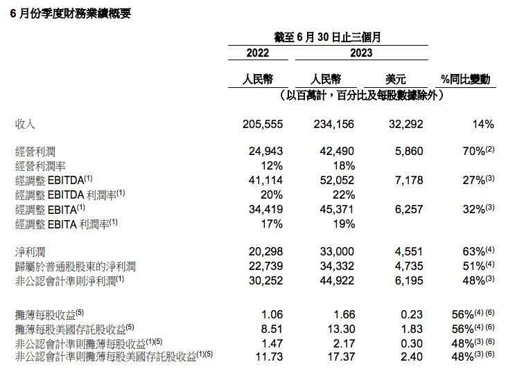 调整后息税折旧及摊销前利润520.5亿元,同比增长27%。