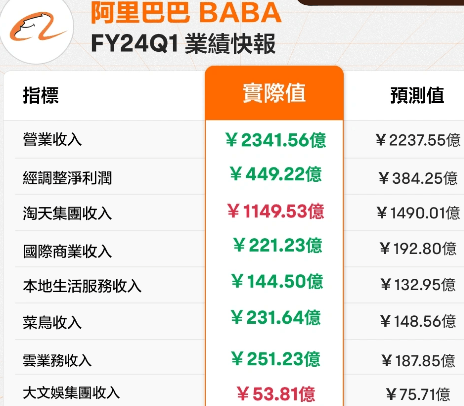 对于淘天的业绩,炒股软件富途也对比了实际增长与国际机构彭博社的预期对比,其中,淘天和大文娱不及预期,其他都超过了预期,彭博社预期是1490亿,实际是1449亿。