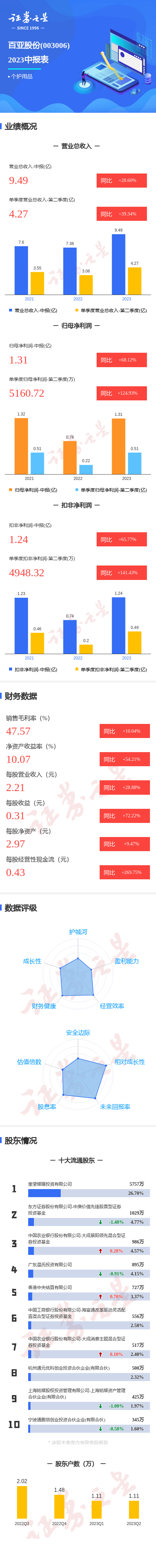 百亚股份2023中报显示,公司主营收入9.5亿元,同比上升28.6%;归母净利润1.32亿元,同比上升68.12%;扣非净利润1.24亿元,同比上升65.77%;其中2023年第二季度,公司单季度主营收入4.27亿元,同比上升39.34%;单季度归母净利润5160.72万元,同比上升124.92%;单季度扣非净利润4948.32万元,同比上升141.43%;负债率24.06%,投资收益397.73万元,财务费用-169.21万元,毛利率47.57%。