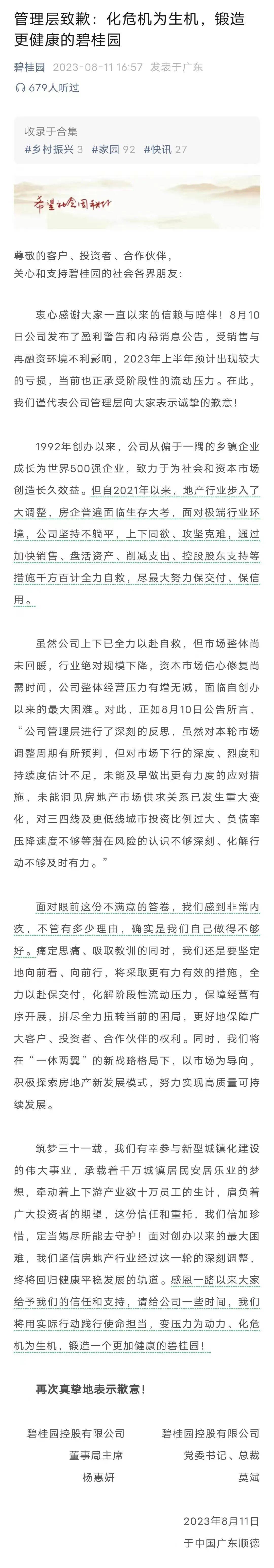 在8月10日晚公告2023年上半年或净亏损450亿-550亿元之后,8月11日傍晚碧桂园通过公司官方微信公众号发出一封致歉信,落款是公司董事局主席杨惠妍及公司总裁莫斌。