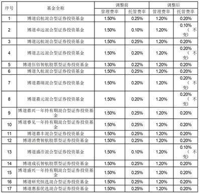 为更好地满足广大投资者的投资理财需求,降低投资者的理财成本,博道基金管理有限公司(以下简称“本公司”)经与旗下部分基金的各基金托管人协商一致,决定自2023年8月14日起,调低旗下部分基金的管理费率和/或托管费率,并对涉及的各基金的基金合同等法律文件的相关条款进行修订。现将有关修订内容说明如下: