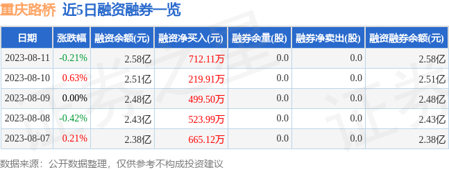 重庆路桥融资融券信息显示,融资方面,当日融资买入912.89万元,融资偿还200.78万元,融资净买入712.11万元,连续3日净买入累计1431.52万元。融券方面,融券卖出0.0股,融券偿还0.0股,融券余量0.0股,融券余额0.0万元。融资融券余额2.58亿元。近5日融资融券数据一览见下表: