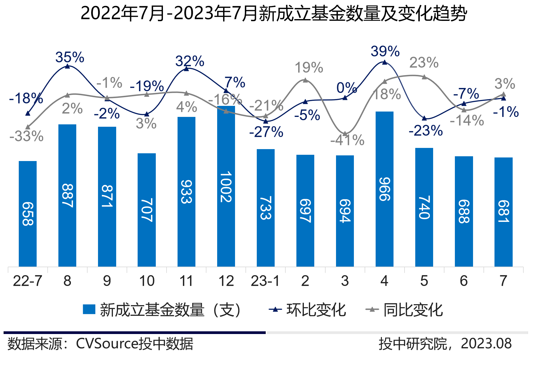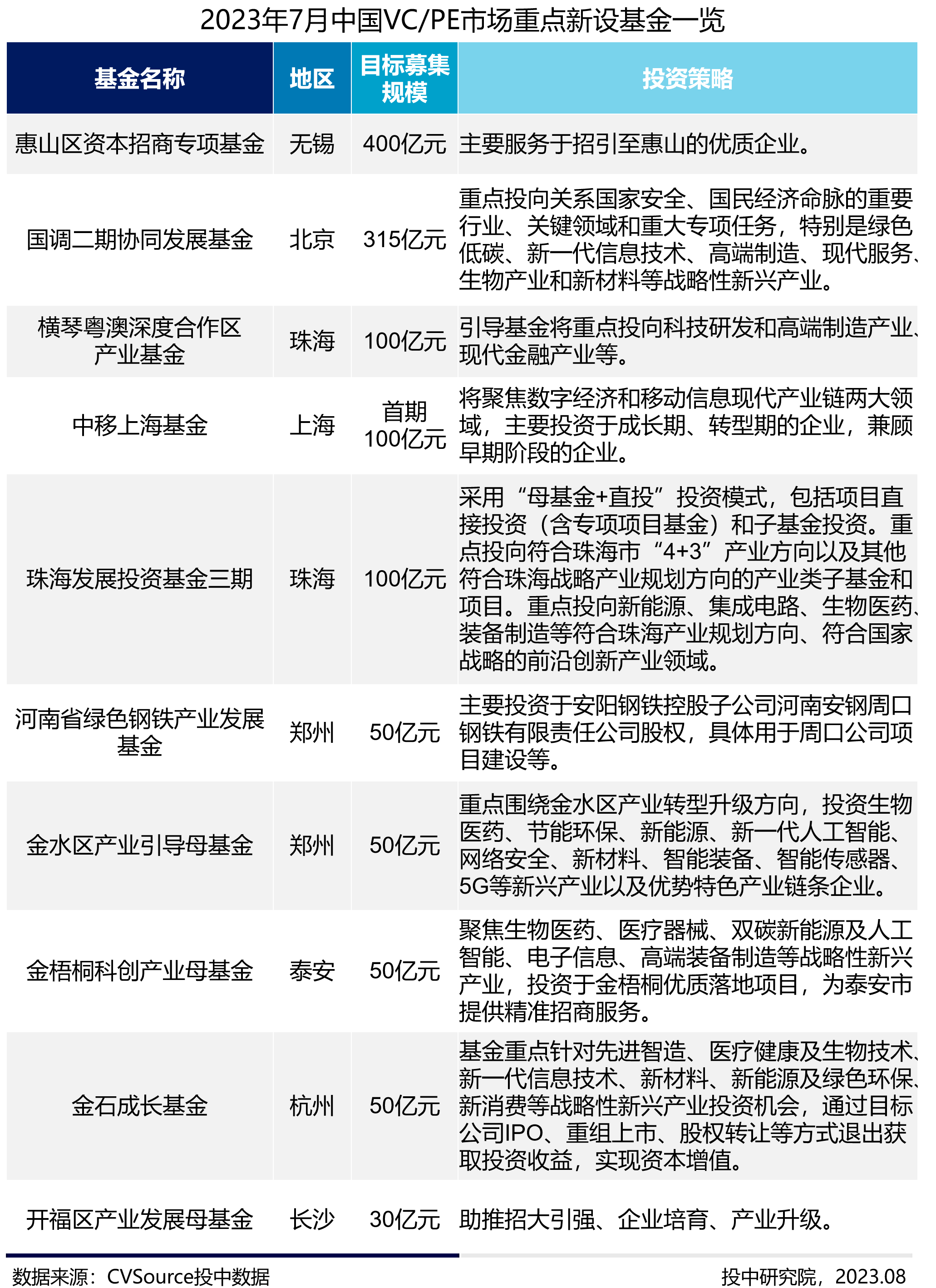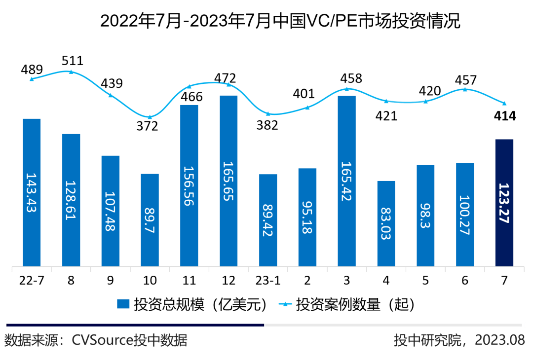 8月11日,投中研究院发布的《2023年7月VC/PE市场报告》(简称《报告》)显示,7月投资市场持续向稳,投资规模环比上升23%;7月新成立基金数量环比持平,同比上升3%。