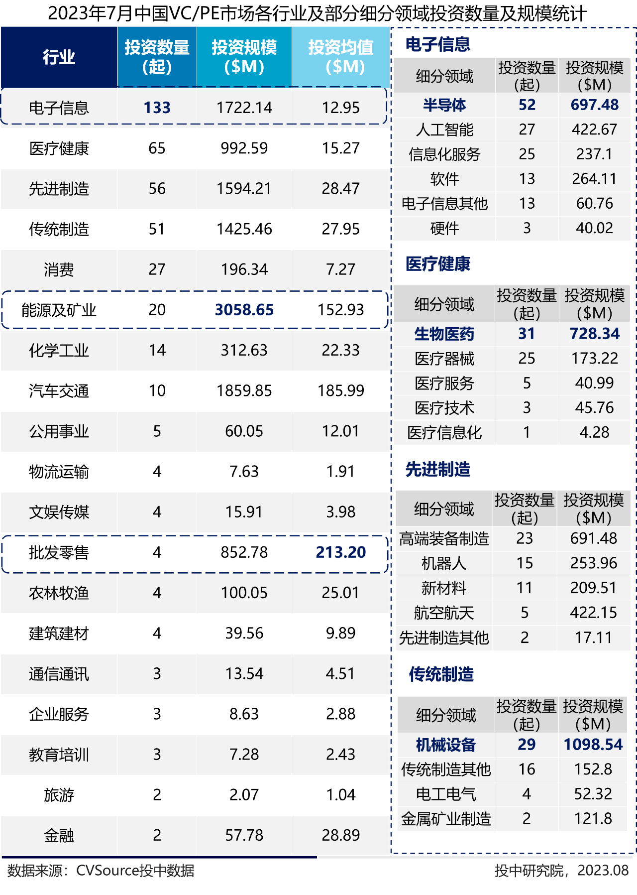 分行业来看,2023年7月,电子信息行业项目获投数量133起最为活跃,能源及矿业获投规模30.59亿美元尤为突出,消费行业中受雪天盐业及曼卡龙非公开发行规模影响,拉动均值达2.13亿美元至行业首位。细分领域下,半导体、生物医药、机械设备分别以52起、31起、29起位列前三。