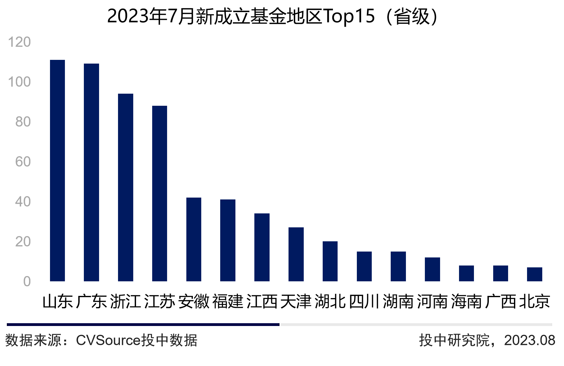 从不同地区来看,2023年7月,共计23个省市区(含港澳台)新设基金,其中,山东省新设数量112只位居首位,广东省新设基金109只,以3只之差屈居第二。