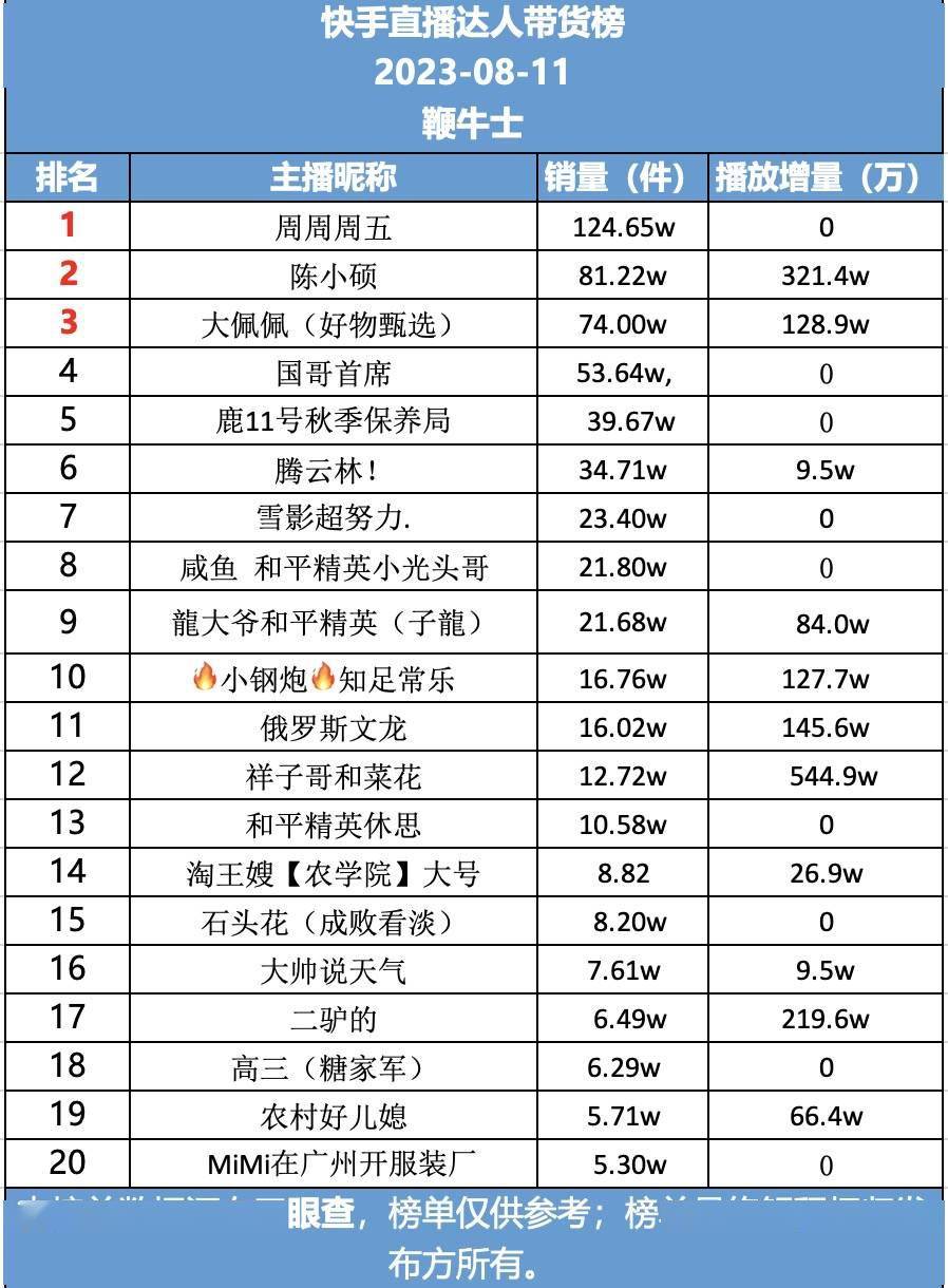 快手榜一周周周五,销量124.65万件;榜二陈小硕,销量81.22万件;榜三大佩佩,销量74万件。
