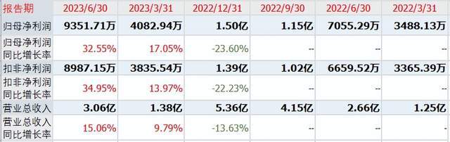 最近三年,公司的营收分别为6.26亿元、6.20亿元和5.36亿元,上年的营收增速为-13.63%。对应的扣非净利润分别为1.71亿元、1.78亿元和1.39亿元,上年的增速为-22.23%。公司预计2023三季度营收比同比增长23.52%至42.30%,净利润同比增长29.92%至50.85%,扣非净利润同比增长40.57%至64.00%。