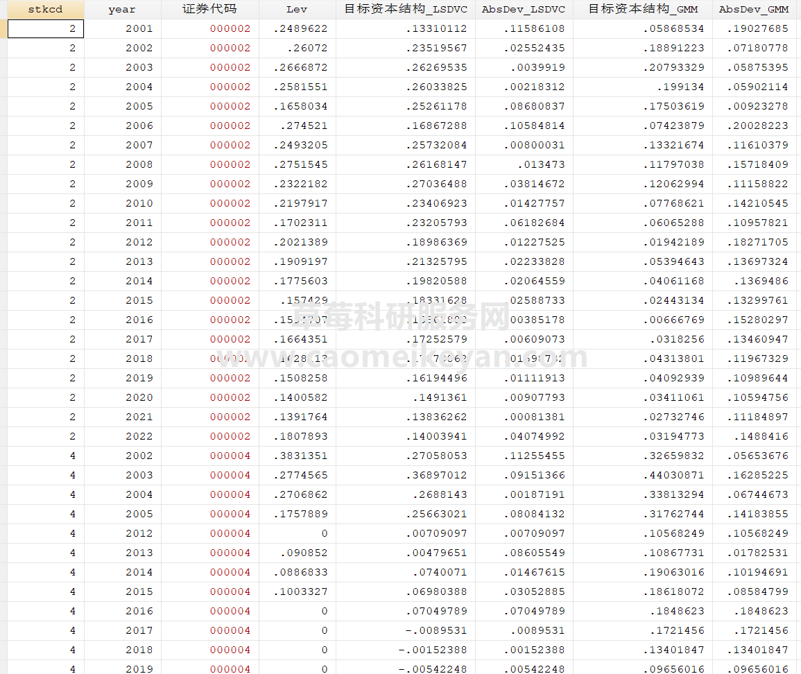 4.数据范围:包括 stkcd year 证券代码 Lev 目标资本结构_LSDVC AbsDev_LSDVC 目标资本结构_GMM AbsDev_GMM,已剔除金融行业、已退市公司、当年ST、*ST或PT类公司样本、缺失值,对连续变量进行缩尾处理