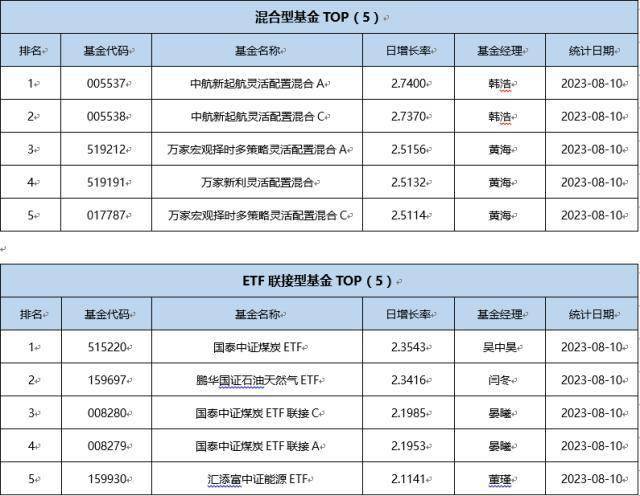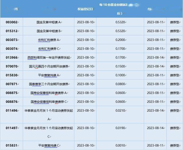 8月10日新发基金共有3只,主要为ETF基金和股票型基金,其中国泰中证有色金属矿业主题ETF联接A募集目标金额达50亿元;基金分红13只,为债券型,派发红利最多的基金是国金及第中短债债券型证券投资基金,每10份基金份额派发红利0.5320元。