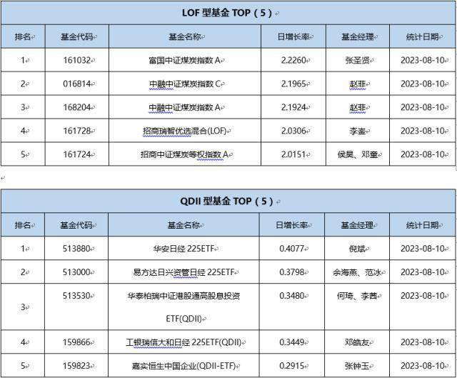 分投资类型看,同样剔除掉分级杠杆及固定收益两类基金的影响,股票型基金冠军为金信消费升级股票A,日增长率为2.8671 %;债券型基金冠军为工银可转债债券,日增长率为2.0529 %;混合型基金冠军为中航新起航灵活配置混合A,日增长率为2.7400 %;货币型基金冠军为融通现金宝货币B,日增长率为0.0187 % ;ETF联接基金冠军为国泰中证煤炭ETF,日增长率为2.3543 % ;LOF型基金冠军为富国中证煤炭指数A,日增长率为2.2260 %;QDII基金冠军为华安日经225ETF,日增长率为0.4077 %;下面是不同类型基金日增长率TOP5 (剔除掉分级基金的影响)