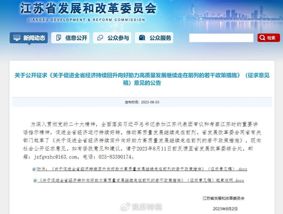 日前,江苏省发改委就《关于促进全省经济持续回升向好助力高质量发展继续走在前列的若干政策措施》公开征求意见。