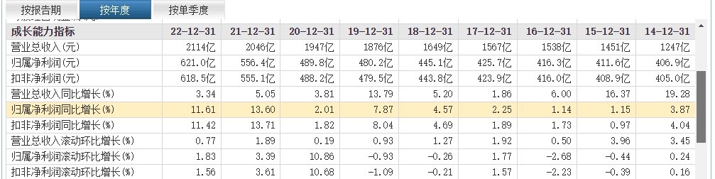 2021年、2022年好一些,归属净利润分别为556.4亿元、621.0亿元,同比增长13.60%、11.61%。