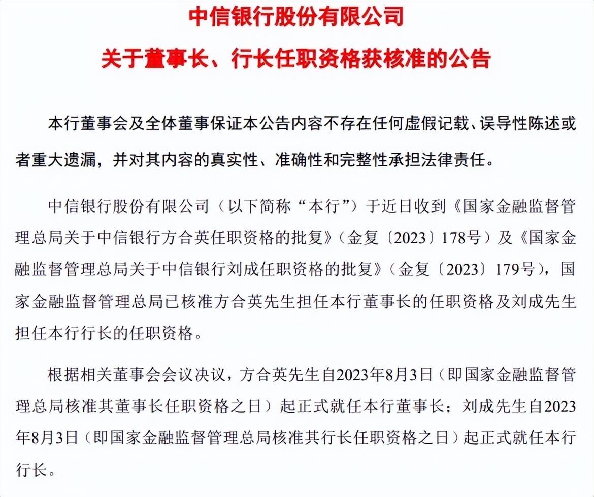 2023年8月7日,中信银行股份有限公司(下午简称“中信银行”)于近日收到国家金融监督管理总局的任职资格批复,该局已核准方合英先生担任该行董事长的任职资格、及刘成先生担任该行行长的任职资格。